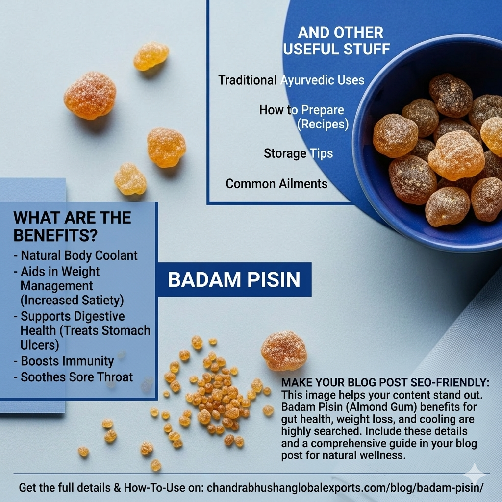 Badam pisin (almond gum) is used primarily as a natural coolant during summer, a digestive support aid, a skin hydrator, and a functional ingredient in traditional Indian drinks and desserts. It is also used in food manufacturing as a natural thickener and in pharma as a vegetarian capsule alternative.